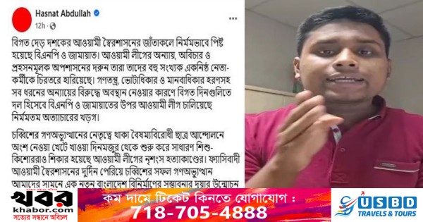 হাসনাত আব্দুল্লাহ লিখেছেন, ‘বিগত দেড় দশকের আওয়ামী স্বৈরশাসনের জাঁতাকলে নির্মমভাবে পিষ্ট হয়েছে বিএনপি ও জামায়াত। আওয়ামী লীগের অন্যায়, অবিচার ও প্রহসনমূলক অপশাসনের দরুন তারা তাদের বহু সংখ্যক একনিষ্ঠ নেতা-কর্মীকে চিরতরে হারিয়েছে।