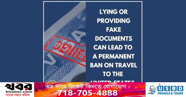 এতে আরও বলা হয়, ‘ভুয়া নথিপত্র দাখিলকারী আবেদনকারীদের কোনো ভিসা দেওয়া হয় না। তাদের বিরুদ্ধে যুক্তরাষ্ট্রের আইন অনুযায়ী এবং সংশ্লিষ্ট দেশেও আইনগত ব্যবস্থা নেওয়া হয়।’