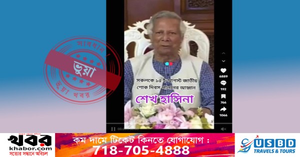অন্তর্বর্তীকালীন সরকারের প্রধান উপদেষ্টা ড. মুহাম্মদ ইউনূস ‘১৫ আগস্টে শোক পালনের আহ্বান জানিয়েছেন’ শীর্ষক দাবিতে একটি ভিডিও অনলাইনের প্ল্যাটফরমে প্রচার হচ্ছে।