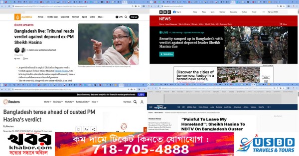 কাতারভিত্তিক সংবাদমাধ্যম আল জাজিরাও ‘ক্ষমতাচ্যুত প্রাক্তন প্রধানমন্ত্রী শেখ হাসিনার বিরুদ্ধে আদালতের রায় আজ’ শিরোনামে লাইভ সম্প্রচার শুরু করেছে।