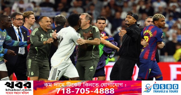 বার্নাব্যুতে রোববার অনুষ্ঠিত উত্তেজনাপূর্ণ এল ক্লাসিকোয় রিয়াল ২-১ গোলে জয় পাওয়ার পর উভয় দলের খেলোয়াড়দের মধ্যে ঝামেলা বাধে।