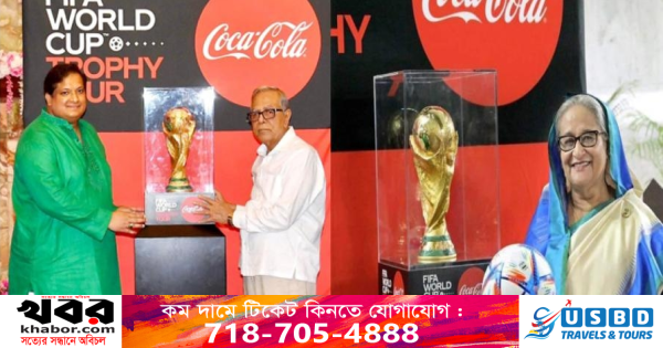 হযরত শাহজালাল বিমানবন্দরে বিশ্বকাপ ফুটবলের ট্রফিটি গ্রহণ করেন বাংলাদেশ ফুটবল ফেডারেশনের সভাপতি কাজী সালাউদ্দিন। এ সময় বাফুফে’র কার্যনির্বাহী কমিটির সদস্যরা উপস্থিত ছিলেন।