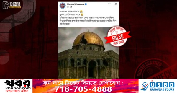 বাংলাদেশি ফ্যাক্টচেকিং সংস্থা রিউমর স্ক্যানারের অনুসন্ধানে জানা যায়, আল-আকসা মসজিদ ক্ষতিগ্রস্ত হওয়ার দাবিটি সত্য নয়। প্রকৃতপক্ষে, আল-আকসা মসজিদের কোনো ক্ষতি হয়নি। আল-আকসার পাশে অবস্থিত সোনালি গম্বুজবিশিষ্ট ‘ডোম অব দ্য রক’-এর আদলে কৃত্রিম বুদ্ধিমত্তা (এআই) দিয়ে তৈরি একটি ছবিকে কেন্দ্র করে ইসরায়েলি হামলায় আল-আকসা ধ্বংসের গুজব ছড়িয়ে পড়েছে।