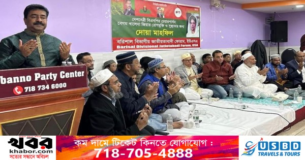 বরিশাল বিভাগীয় জাতীয়তাবাদী ফোরাম ইউএসএ’র উদ্যোগে সাবেক প্রধানমন্ত্রী ও বিএনপির চেয়ারপার্সন বেগম খালেদা জিয়ার রোগমুক্তি ও সুস্থতা কামনায় মিলাদ ও দোয়া মাহফিল অনুষ্ঠিত হয়েছে। জ্যাকসন হাইটসের নবান্ন পার্টি হলে গত ৯ অক্টোবর সোমবার এই মাহফিলের আয়োজন করা হয়। মিলাদ মাহফিলে দোয়া ও মোনাজাত পরিচালনা করেন জামাইকা মুসলিম সেন্টারের ইমাম ও খতিব মওলানা মির্জা আবু জাফর বেগ।