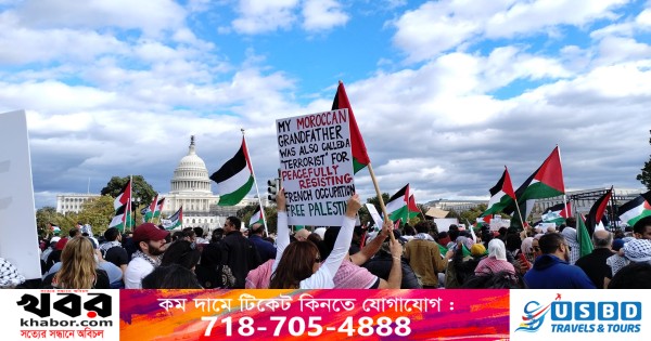 ওয়াশিংটন ডিসি থেকে সালাহউদ্দিন আহমেদ: ফিলিস্তিনের গাজায় ইসরায়েলের নির্বিচার হামলার প্রতিবাদে যুক্তরাষ্ট্রের রাজধানী ওয়াশিংটন ডিসিতে স্মরণকালের নজিরবিহীন বিক্ষোভ সমাবেশ হয়েছে। শনিবার (২১ অক্টোবর) দুপুরে হোয়াইট হাউজের অদূরে এবং ওয়াশিংটন মনমেন্টের সামনে এই সমাবেশ অনুষ্ঠিত হয়। এতে সর্বস্তরের প্রায় অর্ধ লক্ষ মুসলিম নর-নারী অংশ নেন বলে বিক্ষোভে অংশগ্রহকারীরা দাবী করেন। খবর ইউএনএ’র।