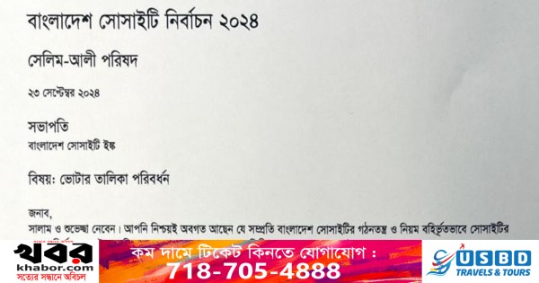 উইয়র্কে বাংলাদেশ সোসাইটির আসন্ন নির্বাচনে সদস্যপদ নবায়ন এবং নতুন সদস্য পদ গ্রহনের শেষ সময় গত ৩০ জুন ছিল। এই সময়ের মধ্যে যারা সদস্য হয়েছেন তারাই আগামী ২৭ অক্টোবরে অনুষ্ঠিত নির্বাচনে ভোটধিকার প্রয়োগ করতে পারবেন। আনুষ্ঠানিকভাবে সোসাইটির মোট ভোটার সংখ্যা ১৮,৬০০ প্রকাশের পর ২৮২ জন ভোটার নিয়ে আপত্তি তোলেন নির্বাচনে প্রতিদ্বন্দ্বিতাকারি সেলিম-আলী পরিষদ। ১৮ সেপ্টেম্বর নির্বাচন কমিশন আরও ৩০৭ ভোটার সংযোজন দেখিয়ে নতুন ভোটার তালিকা প্রকাশ করে। এতে তীব্র আপত্তি তোলেন আতাউর রহমান সেলিম ও মোহাম্মদ আলী। তারা লিখিতভাবে বাংলাদেশ সোসাইটি ও নির্বাচন কমিশনের কাছে এই ৩০৭ ভোট তালিকা থেকে বাদ দেবার দাবি জানান। এ প্রেক্ষিতে সোসাইটির কার্যকরি কমিটি ও ট্রাস্টি বোর্ড ২৬ সেপ্টেম্বর বৃহস্পতিবার যৌথ সভায় মিলিত হয়। সেখানে আলোচনার পর যৌথ কমিটি ৩০৭ ভোট বাতিলের ঘোষণা দেয়। নতুন ভোটার তালিকা প্রকাশের ঘোষণা করা হয়। উল্লেখ্য, এটি হবে সোসাইটির তৃতীয় সংশোধিত ভোটার তালিকা।
