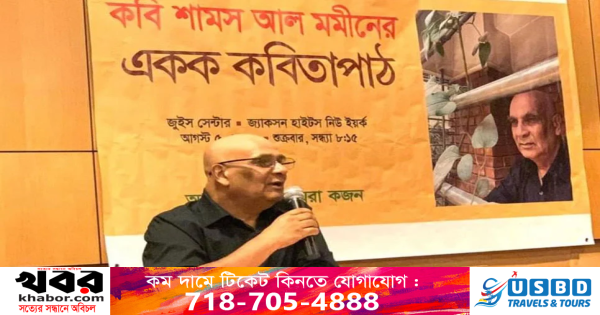 নিউইয়র্ক সিটির জ্যাকসন হাইটসের জুইস সেন্টারে অনুষ্ঠিত হলো প্রবাসের শক্তিমান কবি শামস আল মমীনের একক কবিতা পাঠের দ্বিতীয় আসর। আয়োজনে ছিলো ‘আমরা কজনা’। ৫ আগষ্ট শুক্রবার ঘড়ির কাটায় সন্ধ্যা ৮টা ১৫ মিনিট। মেধাবী সংগঠক নতুন প্রজন্মের সেমন্তী ওয়াহেদের প্রাণবন্ত সঞ্চালনায় শুরু হলো কবি মমীনের কবিতা পাঠের অনুষ্ঠান।