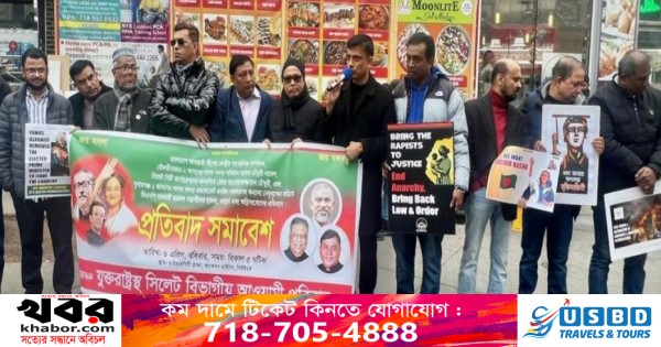 মৌলভিবাজার-২ আসনের সাবেক এমপি শফিউল আলম চৌধুরী নাদেল, সিলেট সিটি কর্পোরেশনের সাবেক মেয়র আনোয়ারুজ্জামান চৌধুরী, সুনামগঞ্জ-১ আসনের সাবেক এমপি এডভোকেট রঞ্জিত সরকারসহ আওয়ামী লীগের নেতা-কর্মীগণের বাড়ি-ঘরে হামলা, লুটতরাজ শেষে অগ্নি সংযোগের উপর্যুপরি বর্বরতার প্রতিবাদ এবং সারা বাংলাদেশে জঙ্গি হামলার অবসান কল্পে অবিলম্বে মোললা অধ্যাপক ড.মোহাম্মসদ ইউনূসের পদত্যাগ দাবিতে গত ৬ এপ্রিল ২০২৫,রবিবার অপরাহ্নে নিউইয়র্কে ‘সিলেট বিভাগীয় আওয়ামী পরিবার’র উদ্যোগে এক র্যালি অনুষ্ঠিত হয়। নিউইয়র্কের জ্যাকসন হাইটসের ডাইভার্সিটি প্লাজায় অনুষ্ঠানরত শান্তিপূর্ণ র্যালি ভন্ডুলের অভিপ্রায়ে জনৈক ব্যক্তি হট্টগোলের চেষ্টার পর পুলিশ ডেকেছিল।