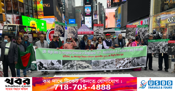 নিউইয়র্কের টাইম স্কয়ারের সমাবেশে বাংলাদেশ জেনোসাইড ১৯৭১কে স্বীকৃতি দিতে জাতিসংঘের প্রতি ১৬ সংগঠনের আহ্বান