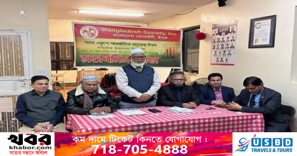 নিউইয়র্ক : নিউইয়র্কে অমর একুশে আর্ন্তজাতিক মাতৃভাষা দিবস পালন উপলক্ষ্যে বাংলাদেশ সোসাইটি ২৯ জানুয়ারি রোববার কমিউনিটির বিভিন্ন সংগঠনের নেতৃবৃন্দের সাথে এক মতবিনিময় সভা করেছে। এলমহার্স্টস্থ সংগঠনের কার্যালয়ে অনুষ্ঠিত সভায় সভাপতিত্ব করেন সভাপতি আব্দুর রব মিয়া। পরিচালনা করেন সাধারন সম্পাদক রুহুল আমিন সিদ্দিকী। অন্যান্য নেতৃবৃন্দের মধ্যে উপস্থিত ছিলেন মহিউদ্দীন দেওয়ান, ফারুক চৌধুরী, আমিনুল ইসলাম চৌধুরী, নওশেদ হোসেন, মাইনুদ্দিন মাহবুব, ডা.শাহানাজ লিপি, আখতার বাবলু, বগুড়া এসোশিয়েশনের সভাপতি মোহাব্বত আকন্দ ও এনায়েত আলী। সভায় মহান একুশে ফেব্রুয়ারিকে কিভাবে সুন্দর ও স্বার্থক করা যায় তা নিয়ে খোলামেলা আলোচনা হয়।