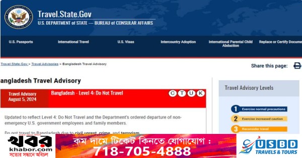 গত ৫ আগস্ট ছাত্র জনতার তীব্র গণ আন্দোলনের মুখে প্রধানমন্ত্রীর পদ থেকে পদত্যাগ করে দেশ ত্যাগ করেন আওয়ামী লীগ সভাপতি শেখ হাসিনা। এর পরদিন মার্কিন দূতাবাসের ওয়েবসাইটে চতুর্থ ধাপের ভ্রমণ সতর্কতা জারি করা হয়।
