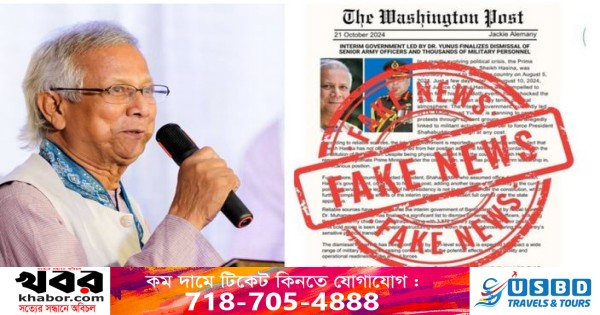 প্রধান উপদেষ্টার প্রেস উইং ফ্যাক্ট চেক ফেসবুক পেজে জানানো হয়েছে, সম্প্রতি জনসাধারণকে বিভ্রান্ত করার অপচেষ্টায় একটি কুচক্রী মহল ওয়াশিংটন পোস্টের নামে প্রধান উপদেষ্টা অধ্যাপক মুহাম্মদ ইউনূসকে নিয়ে একটি ভুয়া প্রতিবেদন সামাজিক যোগাযোগ মাধ্যমে ছড়িয়েছে। ওয়াশিংটন পোস্ট প্রধান উপদেষ্টার প্রেস উইংকে নিশ্চিত করেছে যে প্রতিবেদনটি সম্পূর্ণ মিথ্যা ও বানোয়াট ।