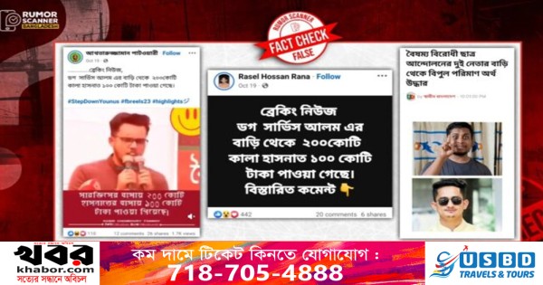 রিউমর স্ক্যানার জানায়, বৈষম্যবিরোধী ছাত্র আন্দোলনের নেতা সারজিস আলম ও হাসনাত আবদুল্লাহর বাড়িতে ২০০ ও ১০০ কোটি টাকা পাওয়ার তথ্যটি সঠিক নয় বরং, বৈষম্যবিরোধী ছাত্র আন্দোলনের কেন্দ্রীয় নির্বাহী কমিটির সদস্য মো. তারিকুল ইসলামের বক্তব্যের একটি খণ্ডিত অংশ প্রচার করে আলোচিত ভুয়া দাবিটি উত্থাপন করা হয়েছে। এ বিষয়ে অনুসন্ধানের শুরুতে উক্ত দাবিতে প্রচারিত ভিডিওটি পর্যবেক্ষণ করে রিউমর স্ক্যানার টিম। এতে এক ব্যক্তিকে বলতে শোনা যায়, আমাদের কেউ দাবায়ে রাখতে পারবে না। চতুর্দিক থেকে ষড়যন্ত্র করা হচ্ছে।