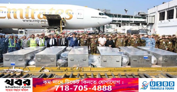 গতকাল শনিবার বেলা ১১টা ৫ মিনিটে এমিরেটস এয়ারলাইন্সের মরদেহবাহী ফ্লাইটটি হযরত শাহজালাল আন্তর্জাতিক বিমানবন্দরে অবতরণ করে। সেনাবাহিনীর চিফ অব জেনারেল স্টাফ লেফটেন্যান্ট জেনারেল মিজানুর রহমান শামীম বিমানবন্দরে শান্তিরক্ষীদের মরদেহ গ্রহণ করেন। এসময় বেসামরিক বিমান চলাচল কর্তৃপক্ষের চেয়ারম্যান; বাংলাদেশে জাতিসংঘের ভারপ্রাপ্ত আবাসিক প্রতিনিধি; আবেইতে মোতায়েনরত জাতিসংঘ মিশন ইউনিসেফের ফোর্স কমান্ডারের প্রতিনিধি, চিফ কমিউনিটি লিয়াজো অফিসার; পররাষ্ট্র মন্ত্রণালয়ের ডিজি (ইউএন); ওভারসিজ অপারেশন পরিদপ্তরের পরিচালক; ঊর্ধ্বতন সামরিক বেসামরিক কর্মকর্তা এবং গণমাধ্যমের ব্যক্তিরা উপস্থিত ছিলেন।