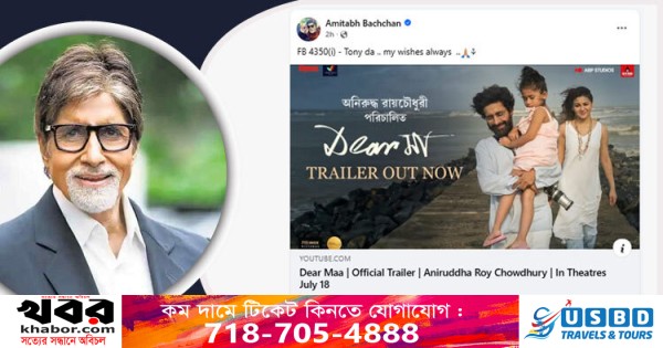 ‘ডিয়ার মা’ মুক্তির আগে বৃহস্পতিবার (৩ জুলাই) সন্ধ্যায় সিনেমাটির ট্রেলার প্রকাশ করা হয়েছে। এটি মুক্তির পর দর্শকদের কাছ থেকে প্রশংসা লাভ করেছে। জয়া আহসানের সিনেমাটির আলোচনা এখন আরও একধাপ বৃদ্ধি পেয়েছে। কারণ বলিউড শাহেন শাহ খ্যাত অমিতাভ বচ্চন ‘ডিয়ার মা’ সিনেমাটির ট্রেলারটি তার সোশ্যাল মিডিয়ায় শেয়ার করেছেন! সেই সঙ্গে নির্মাতাসহ সিনেমাসংশ্লিষ্ট প্রত্যেককে শুভকামনায় ভাসিয়েছেন।