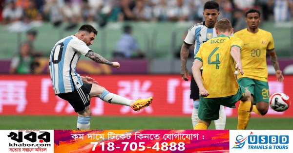 ফিফা উইন্ডোতে প্রথম প্রীতি ম্যাচে অস্ট্রেলিয়ার মুখোমুখি হয়েছে বিশ্বচ্যাম্পিয়ন আর্জেন্টিনা। ম্যাচ শুরুর প্রথম মিনিটেই আলবিসেলেস্তেরা অধিনায়ক লিওনেল মেসির গোলে এগিয়ে গেছে। ডি বক্সের বাইরে থেকে নেওয়া বাঁ পায়ের প্রথম শটেই তিনি গোল পেয়েছেন। বেইজিংয়ের ওয়ার্কাস স্টেডিয়ামে সন্ধ্যায় ৬টায় ম্যাচটি শুরু হয়েছে। এই ম্যাচে পূর্ণ শক্তির দল নিয়েই মাঠে নেমেছে বিশ্বচ্যাম্পিয়নরা।