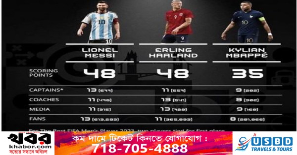 ভোটাররা প্রত্যেকেই মেসি, হালান্ড ও কিলিয়ান এমবাপ্পের মধ্য থেকে প্রথম, দ্বিতীয় ও তৃতীয় বেছেছেন।