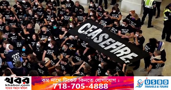 ভেতরে যারা ছিল তারা কালো টি-শার্ট পরা ছিল, যাতে লেখা ছিল ‘ইহুদিরা এখনই যুদ্ধবিরতি চায়’ এবং ‘আমাদের নামে (যুদ্ধ) নয়’। অন্যরা ‘যুদ্ধবিরতি’ লেখা ব্যানার প্রদর্শন এবং গান গেয়েছে।