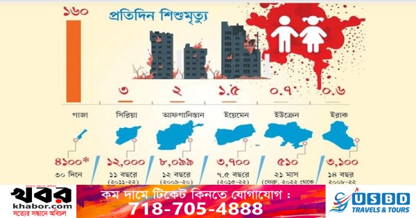 আন্তর্জাতিক অলাভজনক সংস্থা সেভ দ্য চিলড্রেন অক্টোবরের শেষের দিকেই বলেছিল, তিন সপ্তাহেই গাজা উপত্যকায় ইসরায়েলের হামলায় নিহতের সংখ্যা সাম্প্রতিককালের বৈশ্বিক সংঘাতে শিশুমৃত্যুর হারকে ছাড়িয়ে গেছে। অনেক ক্ষেত্রে ছাড়িয়েছে মোট সংখ্যাকেও। মঙ্গলবার রাতে বিশ্ব স্বাস্থ্য সংখ্যা বলেছে, গাজায় গড়ে দিনে মারা যাচ্ছে ১৬০ শিশু। মহাসচিব আন্তোনিও গুতেরেস বলেছেন, গাজা পরিণত হয়েছে শিশুদের কবরস্থানে।