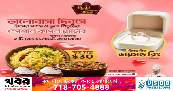 ভালোবাসা দিবসটি উপলক্ষ্যে প্রতিষ্ঠিানটির ব্রঙ্কসের বাংলাবাজার ও জামাইকার হিলসাইডস্থ রেষ্টুনেন্টকে সাজানো হয়েছে ভালোবাসার আদলে। ভালাবাসা দিবসের স্পেশাল খাবার সরবরাহ করতে প্রস্তুত খলিল বিরিয়ানী হাউজ। মেনুতে রয়েছে হাঁসের মাংশ ও ভুনা খিচুরির স্পেশাল কাপল প্ল্যাটার। এর সাথে থাকছে ২টি রেড ভেলভেট কাপ কেক। ভালাবাসা পিপাসুদের জন্য প্রতিষ্ঠানটির সিইও খরিলুরর রহমান বোনাস হিসেবে রেখেছেন র্যাফেল ড্র। এতে পুরস্কার হিসেবে থাকছে ডায়মন্ডের রিং। মাত্র ৩০ ডলারে কাপলদের জন্য হয়েছে লাঞ্চ বা ডিনার । এ অফার শুধু ১৩ ও ১৪ ফেব্রুয়ারির জন্য।