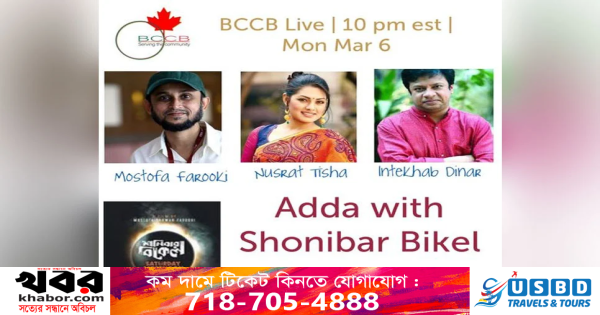 কানাডাভিত্তিক বাংলাদেশিদের বৃহত্তম ফেসবুক গ্রুপ ‘বাংলাদেশি কানাডীয়ান কানাডীয়ান বাংলাদেশি’ – বিসিসিবি এই আড্ডার আয়োজক। আগামী ৬ মার্চ সোমবার রাত ১০ টায় (টরন্টো সময়), ৭ মার্চ সকাল ৯টা (বাংলাদেশ সময়) অনুষ্ঠেয় এই আড্ডা বিসিসিবি প্লাটফরম (বিসিসিবি ফেসবুক গ্রুপ) থেকে সরাসরি সম্প্রচারিত হবে। ইকো আজহারের সঞ্চালনায় এই আড্ডায় বিসিসিবি প্রধান রিমন মাহমুদও অংশ নেবেন।