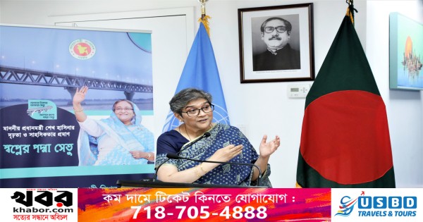 নিউইয়র্ক: জাতীয় উদযাপনের অংশ হিসেবে আজ প্রবাসী বাংলাদেশীদের সাথে নিয়ে অত্যন্ত উৎসবমূখর পরিবেশে ‘প্রধানমন্ত্রী শেখ হাসিনা কর্তৃক পদ্মা সেতু উদ্বোধন’ উদযাপন করল নিউইয়র্কস্থ জাতিসংঘে বাংলাদেশ স্থায়ী মিশন। স্থানীয় সময় বেলা ১২ টায় মিশনস্থ বঙ্গবন্ধু মিলনায়তনে আয়োজিত এ অনুষ্ঠানে যোগ দেন যুক্তরাষ্ট্র আওয়ামী লীগ ও এর সহযোগী সংগঠনের নেতৃবৃন্দ, প্রবাসী মুক্তিযোদ্ধা, সাংবাদিক ও বিভিন্ন সামাজিক-সাংস্কৃতিক সংগঠনের নেতৃবৃন্দ।